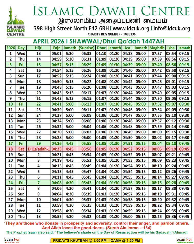 Jum’ah – 1:00 PM To 1:30 PM